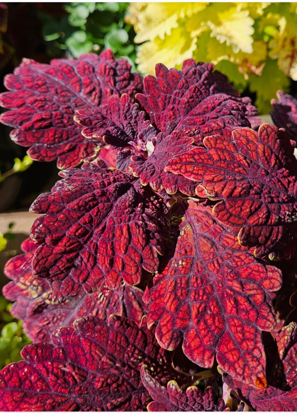 Колеус сорта «Кока-Кола» (Coca-Cola) выделяется своей необычной текстурой и глубоким цветом.
